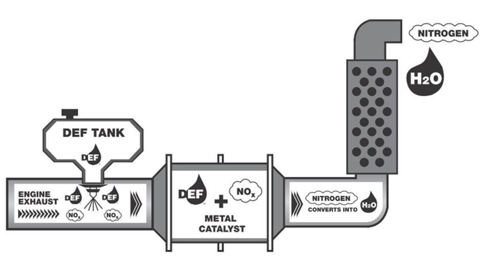 Diesel engines are typically operated with a lean burn air-to-fuel ratio (over stoichiometric ratio) to ensure the full combustion of soot and to prevent them from exhausting unburnt fuel. The excess air leads to the generation of NOx, which are harmful pollutants, from nitrogen in the atmosphere. SCR is used to reduce the amount of NOx released into the atmosphere. DEF from a separate tank is injected into the exhaust pipeline, and the exhaust heat decomposes it to ammonia. Within the SCR catalyst, the NOx is reduced by the ammonia into water and nitrogen, which are both non-polluting. The water and nitrogen are then released into the atmosphere through the exhaust.